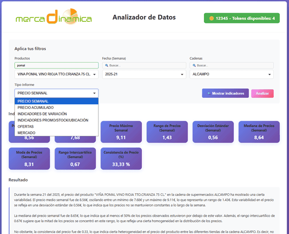 Aplicación diseñada para analizar el comportamiento del precio de un producto en una semana, una cadena o el conjunto del mercado, generando indicadores estadísticos clave y elaborando automáticamente informes interpretativos mediante inteligencia artificial.